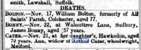 1891 Census: Hall Street East, Melford (age 66). Occupation: wheelwright.